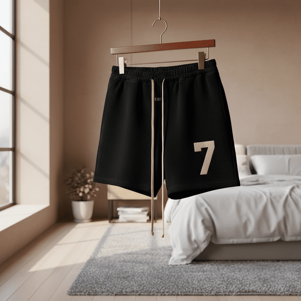 Fear of God 7 Collection black cotton shorts, soft breathable fabric, elastic waist with beige drawstring, gold No.7 print, unisex streetwear by Jerry Lorenzo, modern versatile casual style.