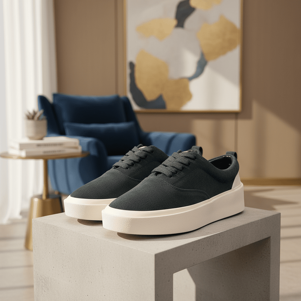 Fear of God (FOG) deep green suede low-top sneakers with thick sole, streetwear style, unisex design, ideal for daily casual outfits, showcasing FOG’s unique modern aesthetic.