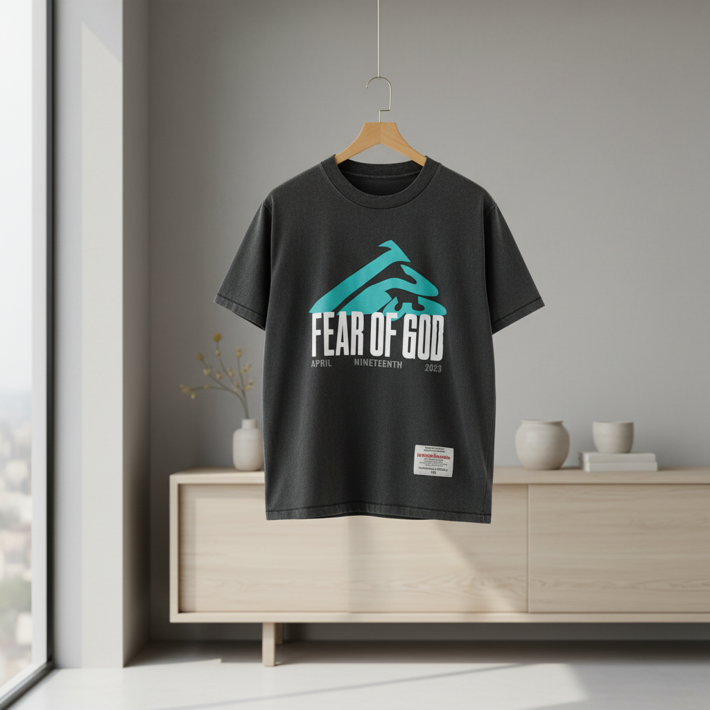 Fear of God 2023 Limited Washed Black T-Shirt, soft cotton fabric, blue-green totem with brand logo and date print, streetwear style, unisex, breathable, stylish, comfortable.