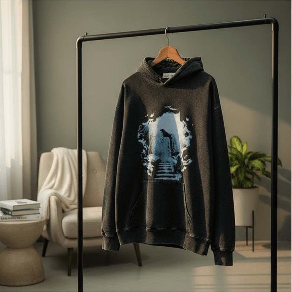 Fear of God (FOG) black hoodie made of premium breathable cotton, featuring a front stair figure print and back handwritten graphic with logo, unisex streetwear for stylish daily casual looks.