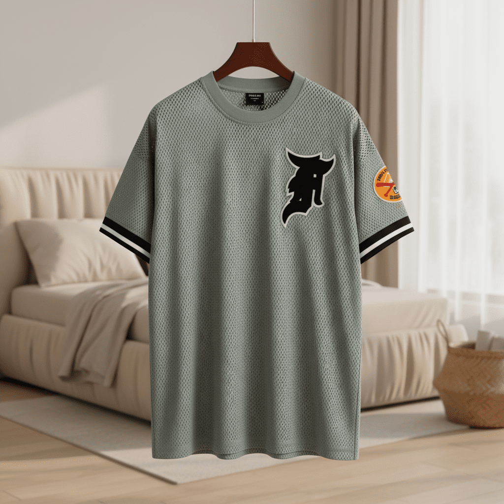 Fear of God gray mesh T-shirt, breathable fabric with black embroidered logo on chest, black-white striped sleeves, orange brand patch, unisex street style, casual and versatile.