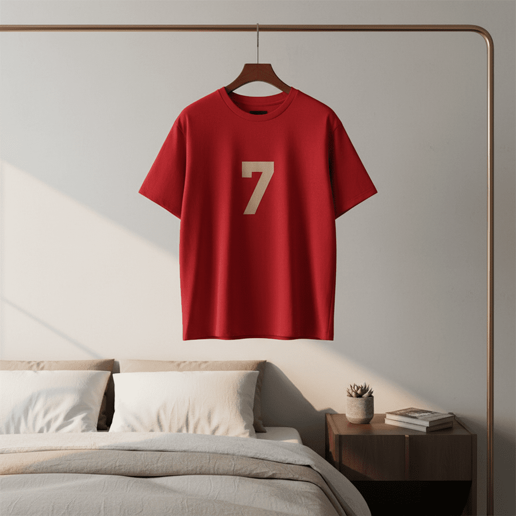 Fear of God (FOG) Red Number 7 Cotton T-Shirt, white back print, streetwear style, unisex design for daily casual comfort and effortless fashion.