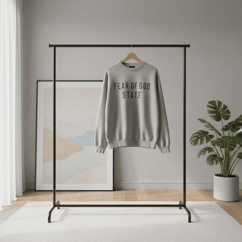 Fear of God STATE Grey Crewneck Sweatshirt, made from premium soft breathable cotton, features bold FEAR OF GOD STATE print, relaxed unisex fit, perfect for streetwear and everyday casual style.