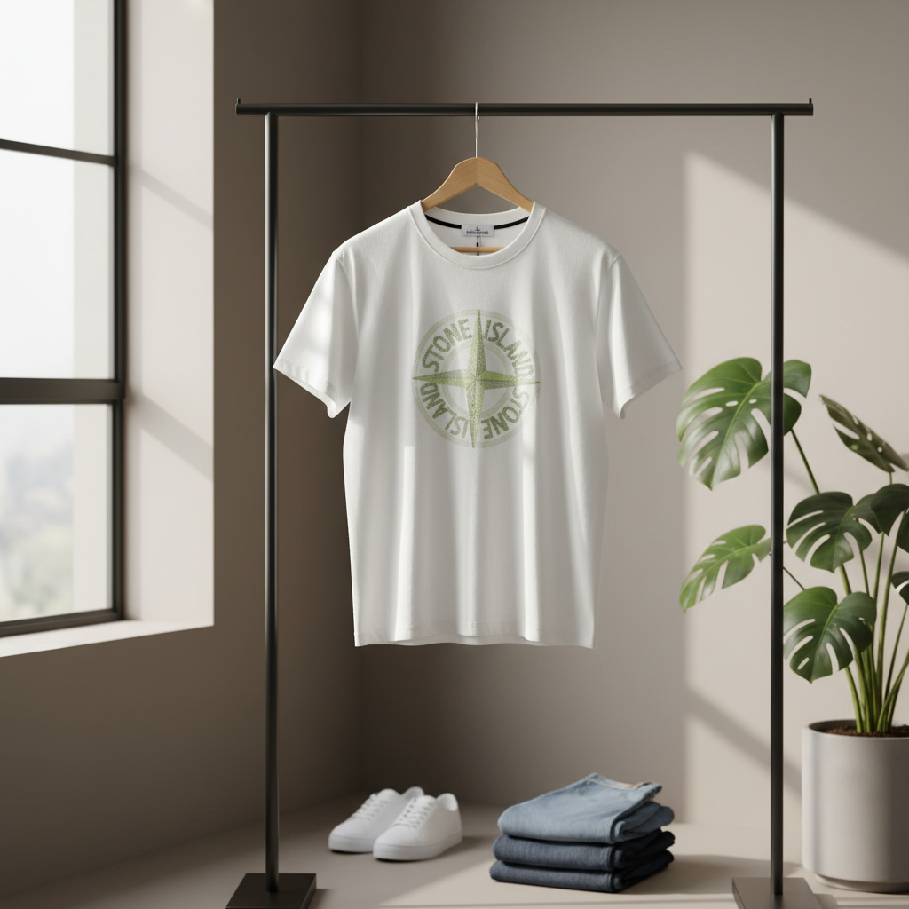 Fear of God x Stone Island White Cotton T-Shirt featuring iconic compass logo, streetwear style, unisex design for daily casual wear, stylish comfort and unique brand identity.