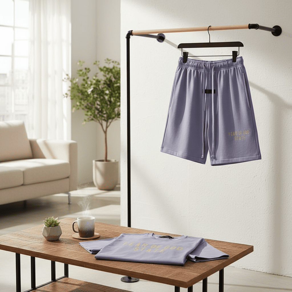 Fear of God Essentials State Set in Light Purple, soft breathable cotton, gold letter print tee, drawstring shorts, unisex streetwear style, perfect for daily casual fashion comfort.