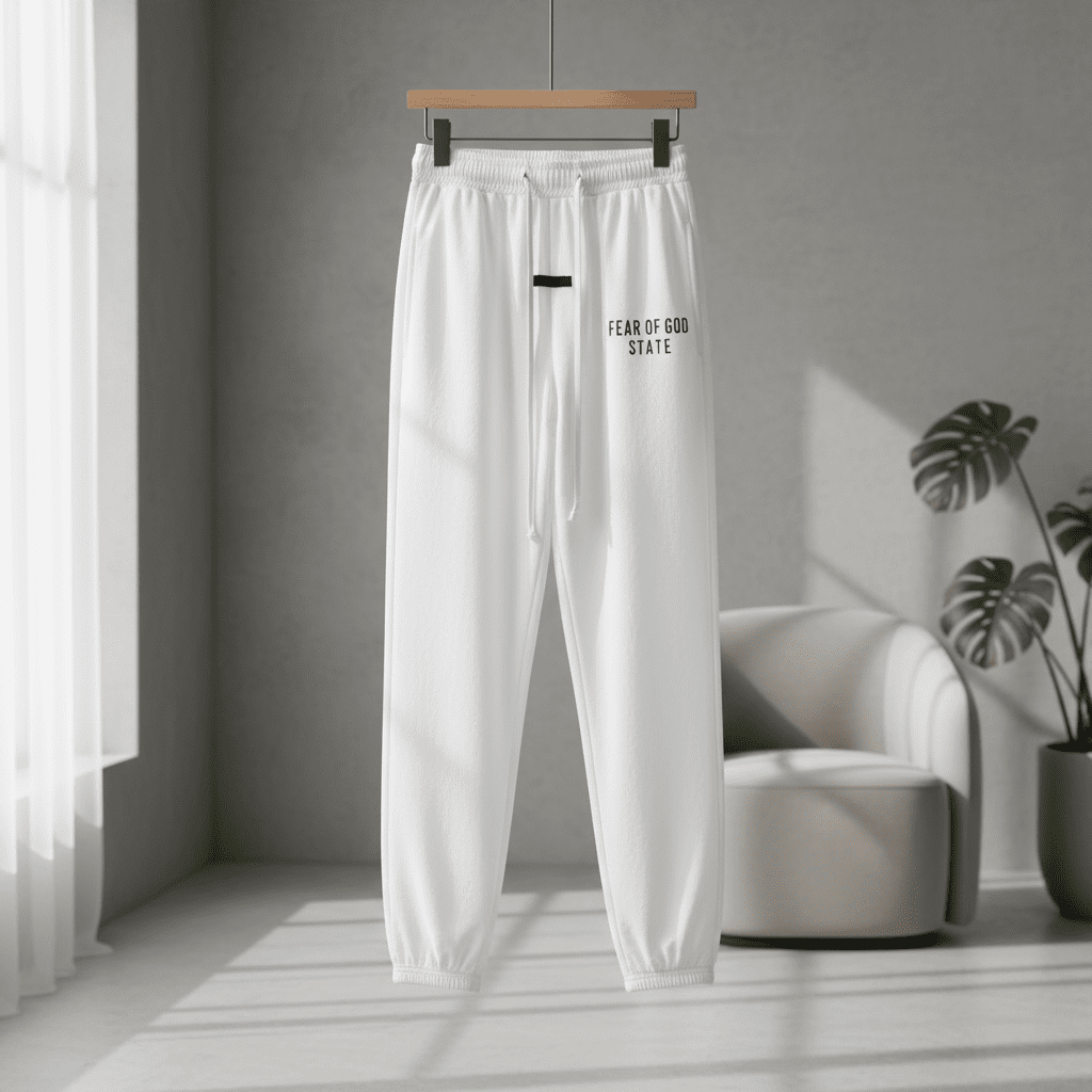 FEAR OF GOD Essentials white jogger pants, lightweight and breathable fabric, elastic waistband with drawstring, side logo design, unisex streetwear style, perfect for daily casual comfort.