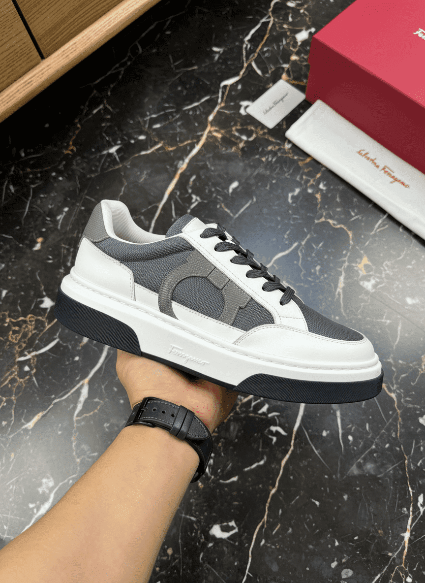 Ferragamo Casual Napa Leather Sneakers Mesh Sole Grey White