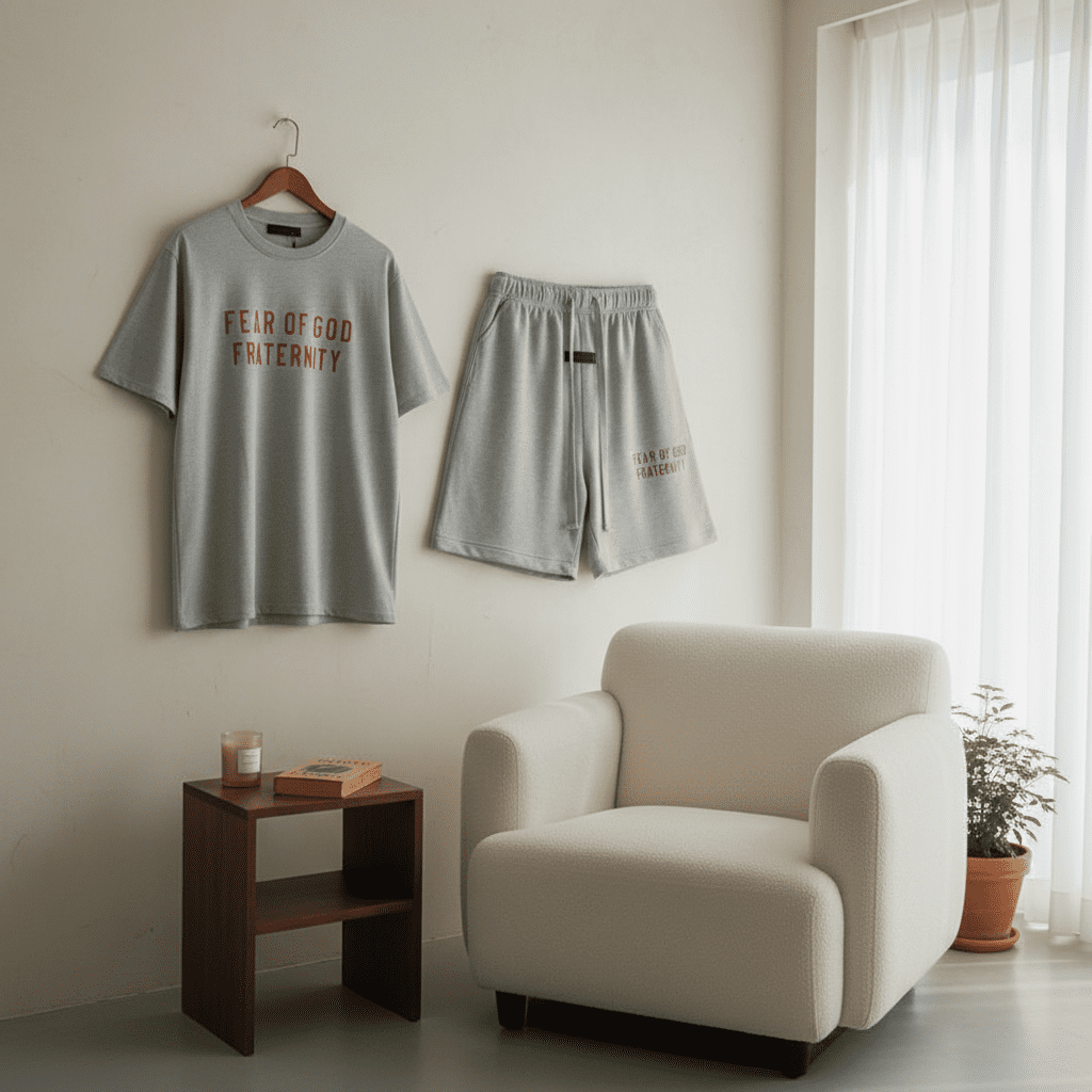 Fear of God Essentials FRATERNITY gray cotton set, soft breathable fabric, red “FEAR OF GOD FRATERNITY” print, unisex streetwear style, perfect for casual daily comfort and fashion.