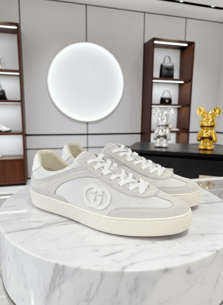 Step into style with these chic 3D GG trainers in white. Suede, mesh, leather blend for comfort. Classic GG logo, slip-resistant sole. Perfect for fashion-forward sneaker lovers!