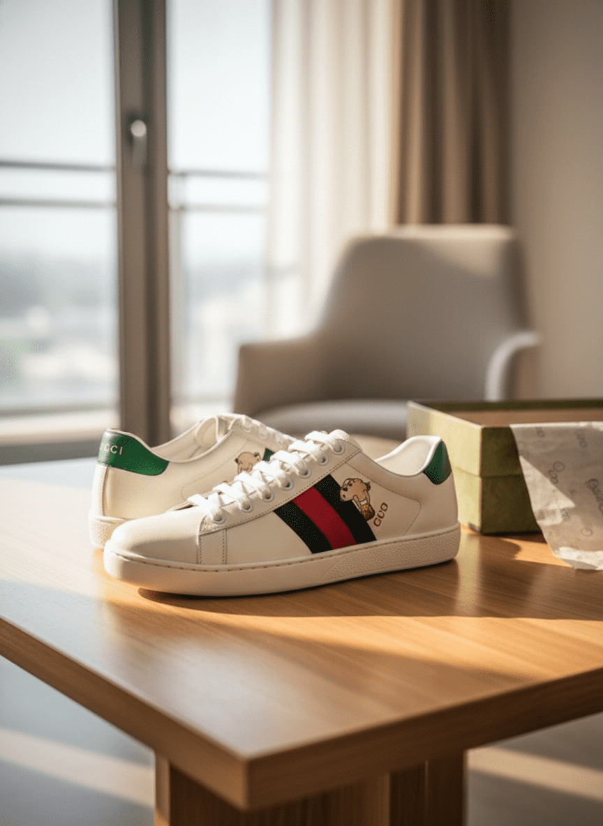 Gucci Ace White Sneakers feature premium leather, iconic red-green web stripe, playful pig embroidery, green heel detail, lace-up fit, unisex design, offering stylish luxury and all-day comfort.
