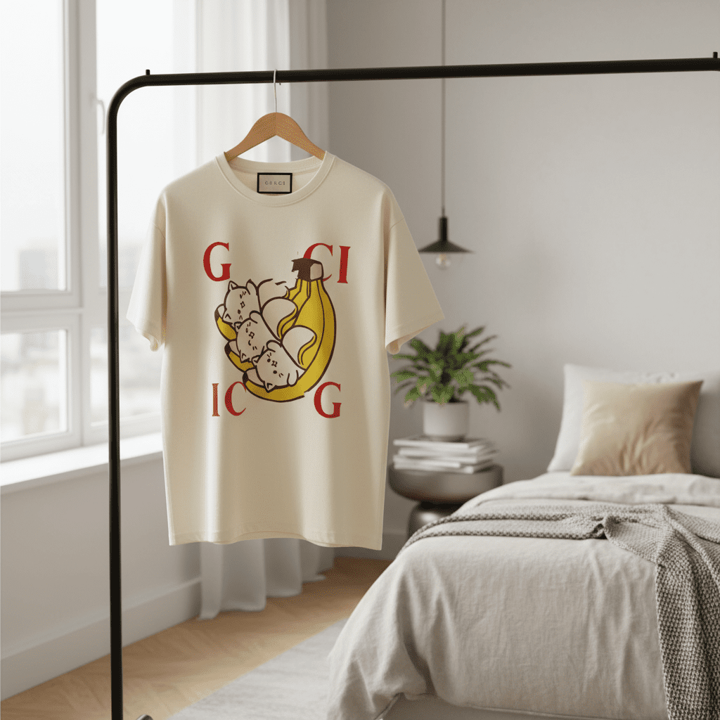 Gucci Off-White Cotton T-Shirt featuring playful banana cat graphic with red letter design, breathable soft fabric, unisex casual style, perfect for trendy daily wear with luxury charm.