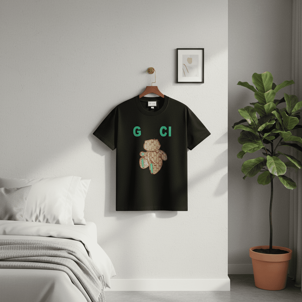 Gucci Bear Series Black Cotton T-Shirt, featuring iconic GG bear pattern and green G CI logo, unisex casual style with a cute fashion touch, perfect for everyday wear and brand lovers.