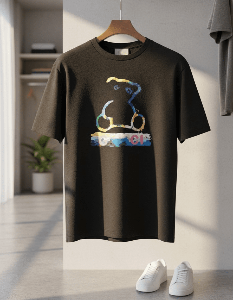 Gucci Graffiti Series Black T-Shirt, crafted from soft breathable cotton, features a colorful bear graffiti logo and brand lettering, unisex design, trendy streetwear for daily casual style.