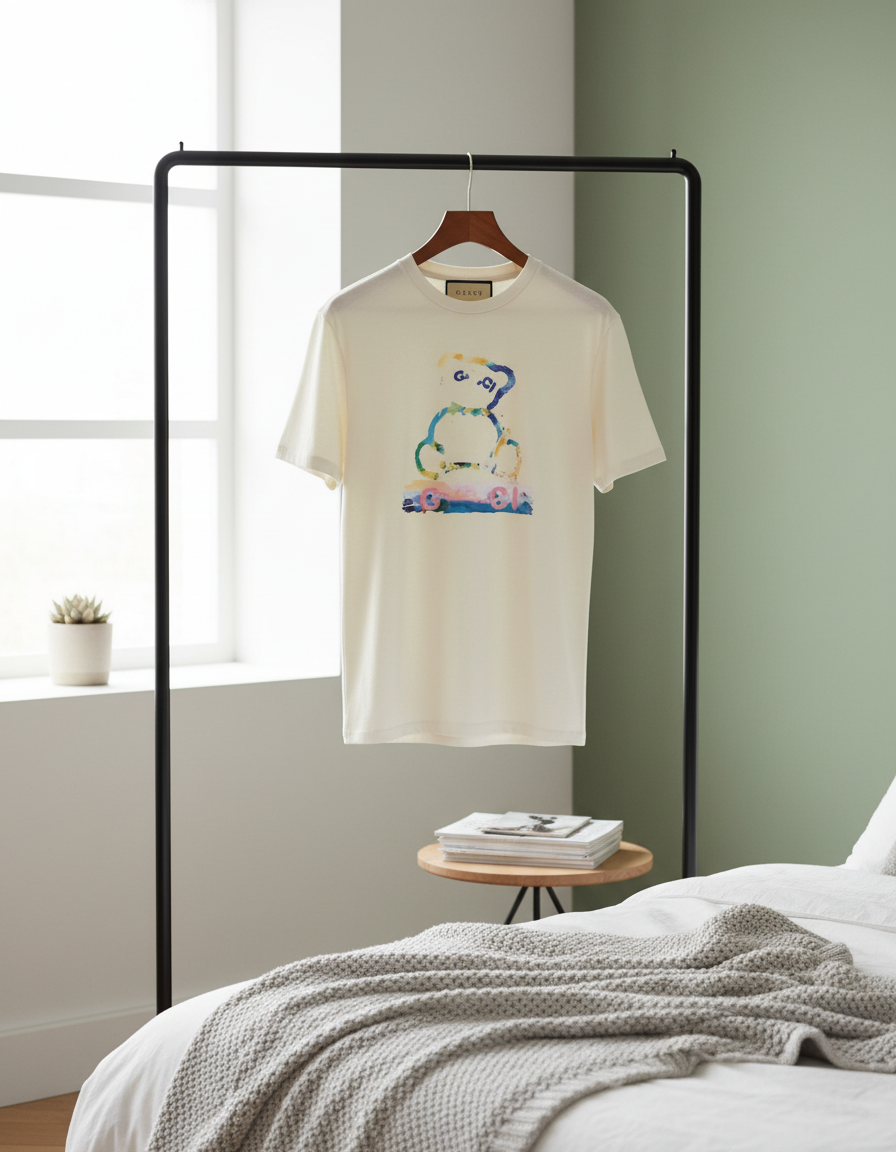 Gucci Off-White T-Shirt crafted from premium cotton, featuring a colorful graffiti bear and logo print. Unisex loose fit, soft and breathable, perfect for casual trendy daily wear.