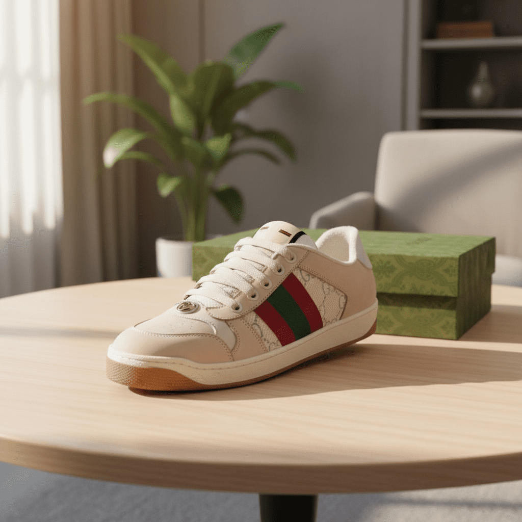 Gucci Off-White Retro Sneakers, suede and snakeskin print panels, signature red-green web detail, breathable, unisex casual luxury shoes showcasing timeless high-end Italian fashion.