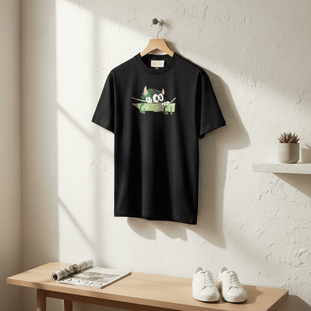 Gucci Black Cartoon Graphic T-Shirt made of premium cotton for soft comfort, featuring a playful green devil with Gucci logo, unisex design, perfect for trendy casual style and fashion lovers.