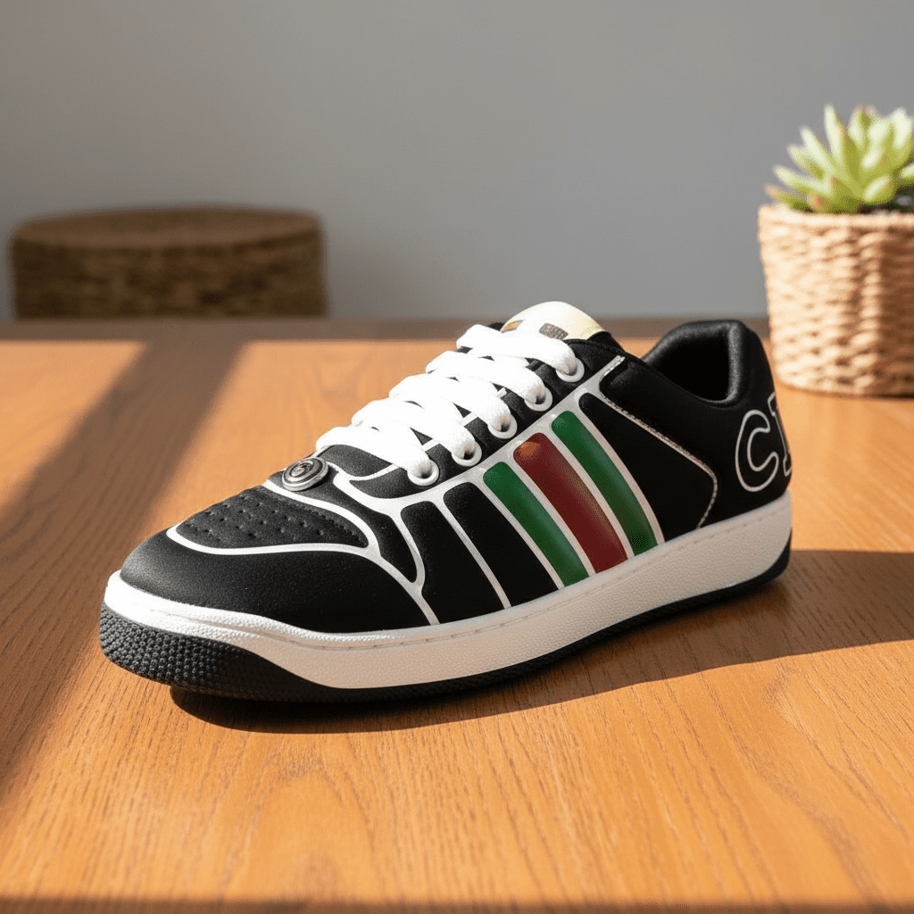 Gucci Classic Black Casual Sneakers blend canvas and suede with iconic red-green stripes, white detailing, and side logo. Unisex retro style perfect for daily fashion wear.