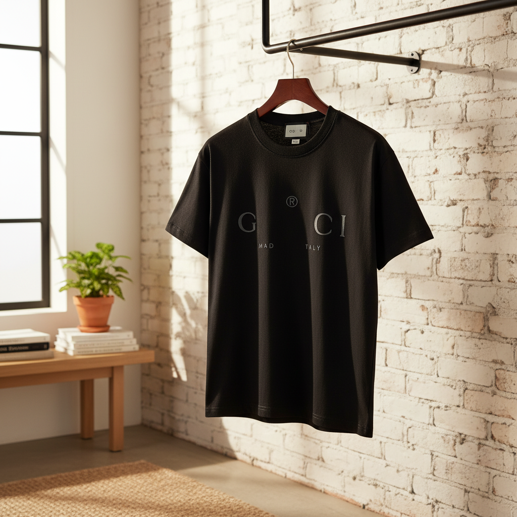 Gucci Classic Black T-Shirt, made from premium cotton with minimalist letter print, unisex luxury casual style, soft and comfortable for daily wear, showcasing refined elegance and understated charm.
