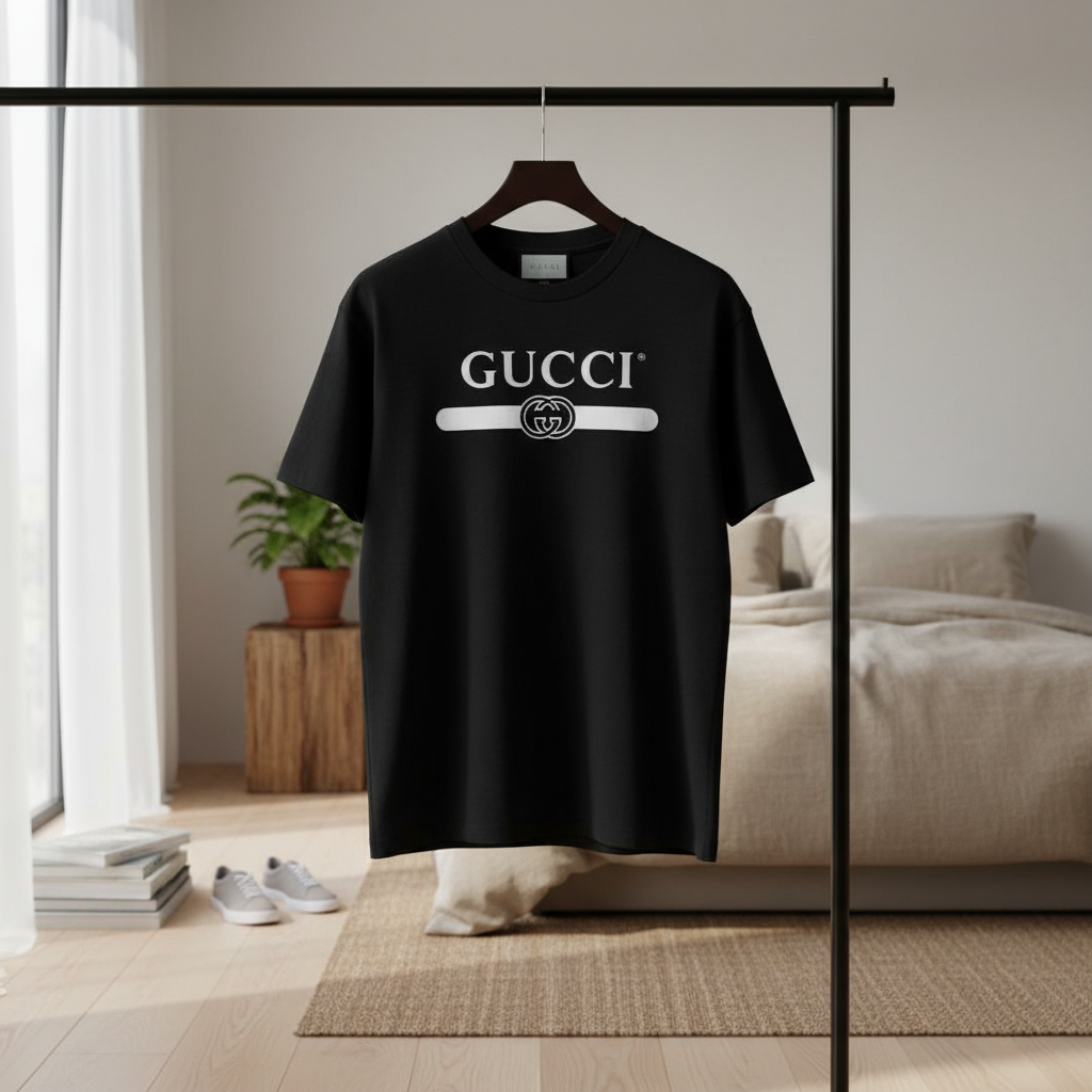 Gucci Classic Black T-Shirt in premium cotton, soft and breathable. Features white logo letters and iconic round print. Unisex design for stylish, casual everyday wear with timeless brand elegance.