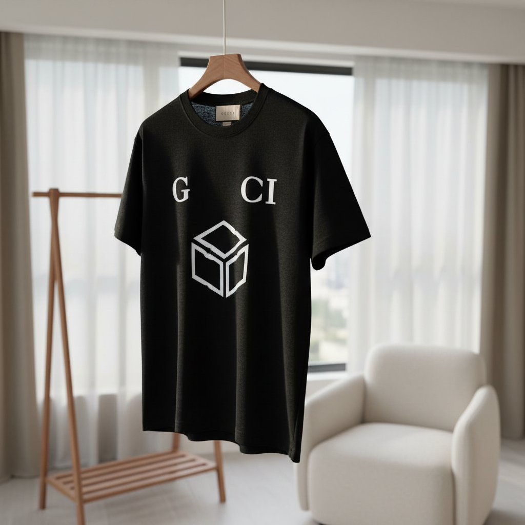 Gucci Black Cotton T-Shirt: Soft, breathable premium fabric with white “G CI” letters and cube graphic. Unisex, minimalist style perfect for daily casual wear, showcasing signature Gucci elegance.