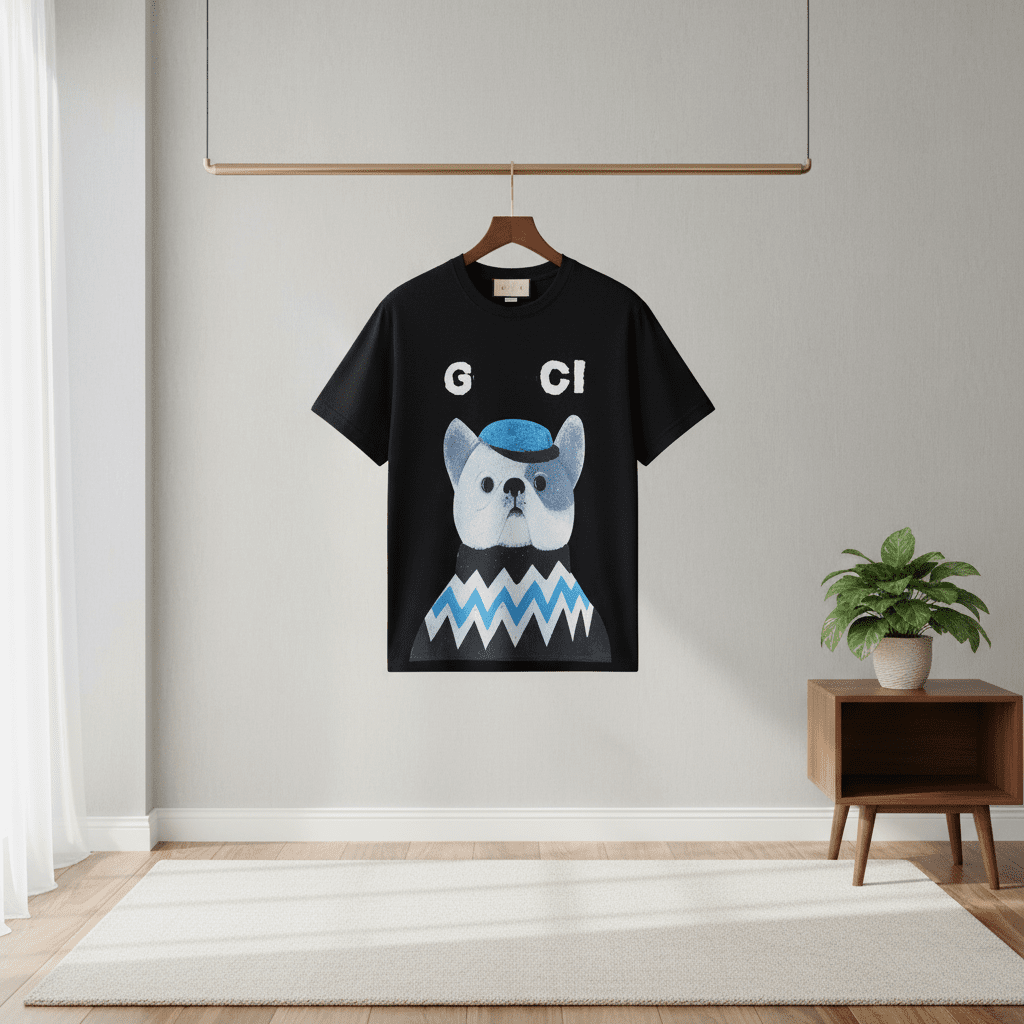Gucci Black T-Shirt Animal Series, soft cotton, comfy round neck, French Bulldog print with blue hat and zigzag pattern, unisex casual style showing unique fashion charm.