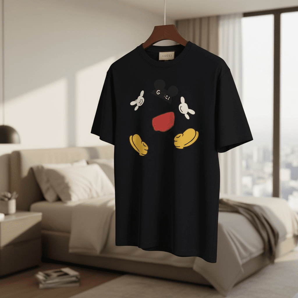 Gucci x Mickey Black Cotton T-Shirt features a split Mickey design and “G.CI” logo. Made from premium breathable cotton, this unisex top adds stylish comfort and playful charm to everyday outfits.