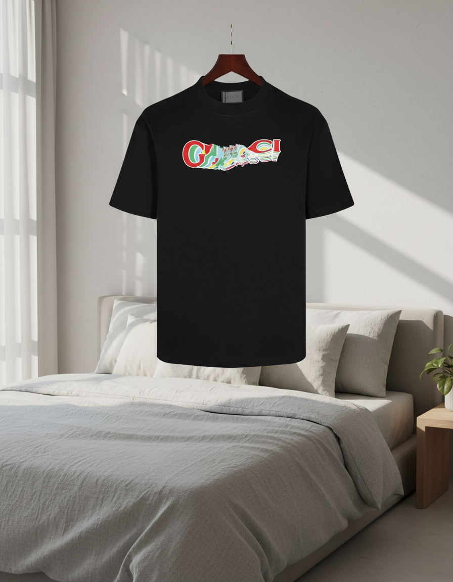 Gucci black cotton T-shirt featuring a colorful artistic Gucci logo print on the front, classic crew neck, short sleeves, breathable fabric, unisex fit, perfect for casual wear and trendy street style.