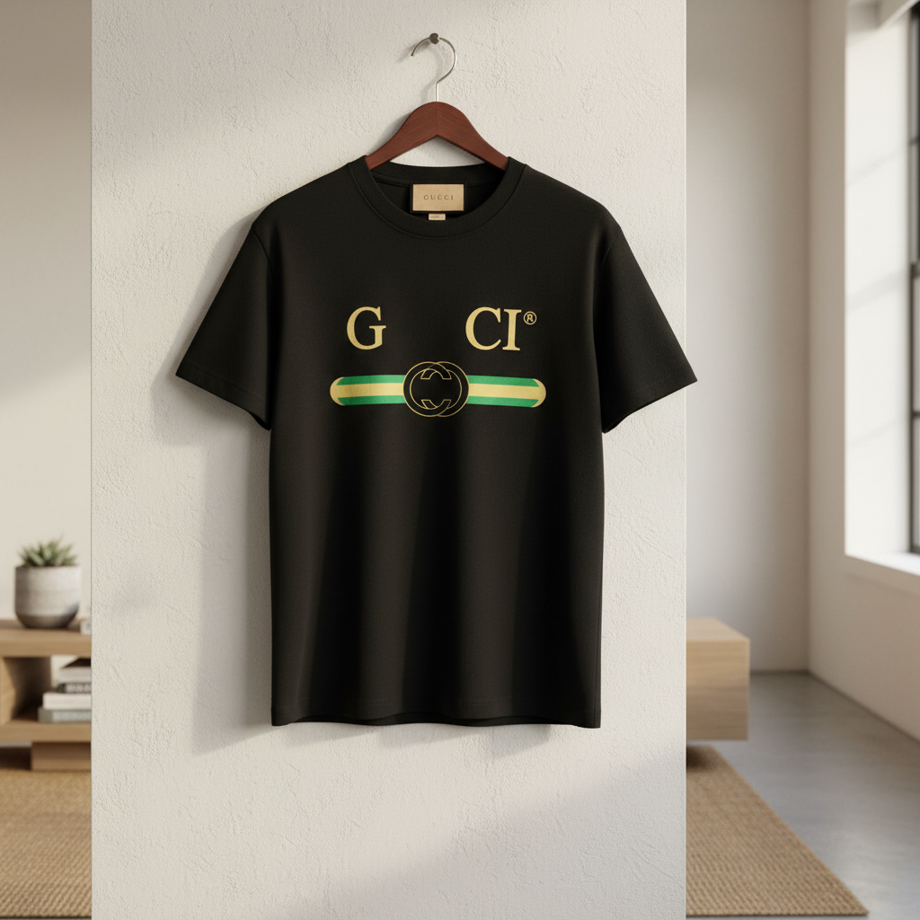 Gucci Double G Series Black T-Shirt, made of soft breathable cotton, features gold lettering, signature GG logo, and green stripe design. Unisex luxury casual wear with iconic brand style.