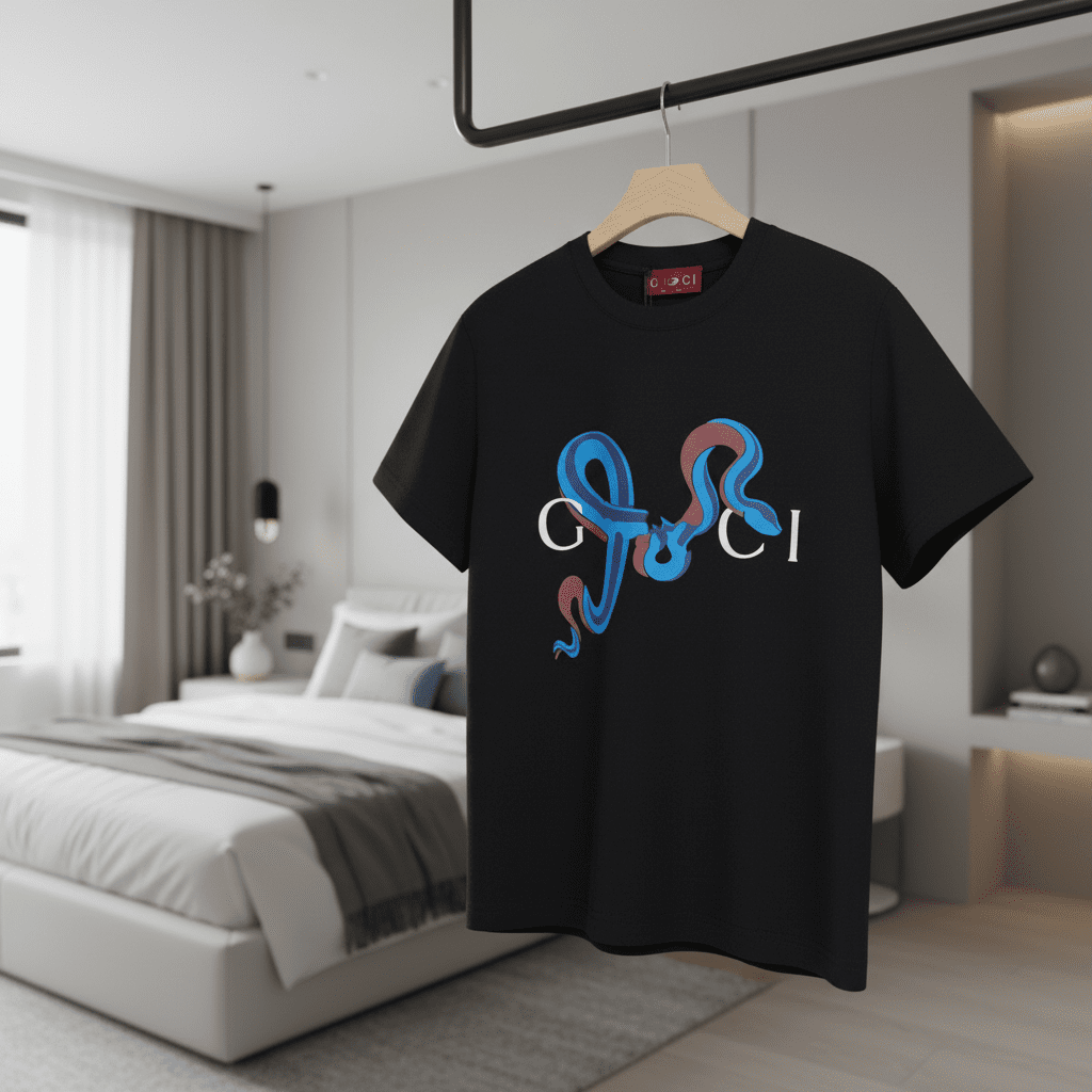 Gucci Black Cotton T-Shirt with Blue and Red Snake Print and Iconic Gucci Logo, Soft and Skin-Friendly Fabric, Classic Crew Neck Design, Unisex Luxury Fashion for Daily Casual Wear.