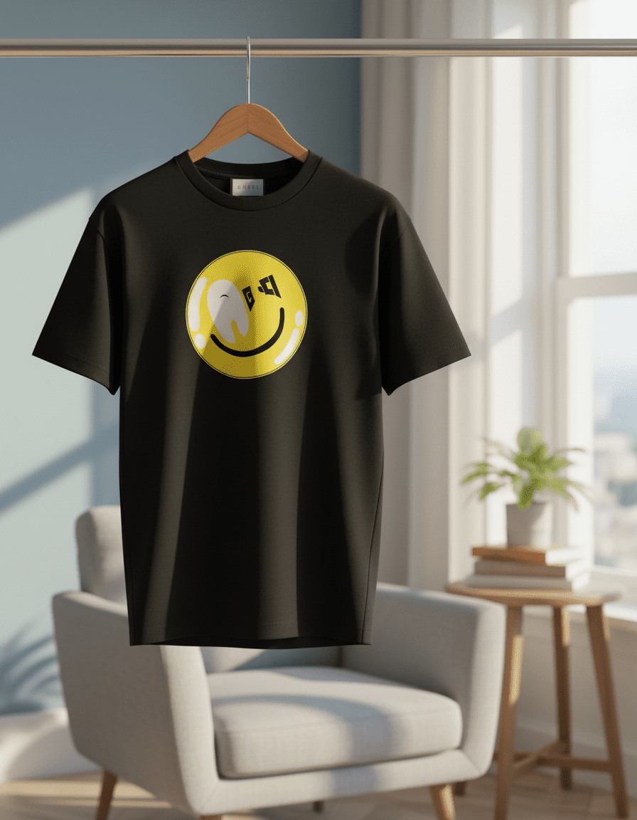Gucci Trend Collection Black T-Shirt – soft breathable cotton, featuring a bold yellow smiley face design, unisex casual style for comfortable and fashionable everyday wear.