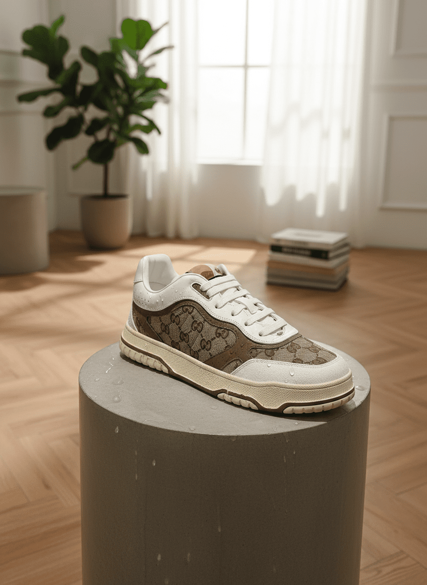 Gucci classic brown and white sneakers feature mesh and leather panels with iconic Double G motif, low-top lace-up design, unisex retro style, breathable comfort, and timeless streetwear appeal.
