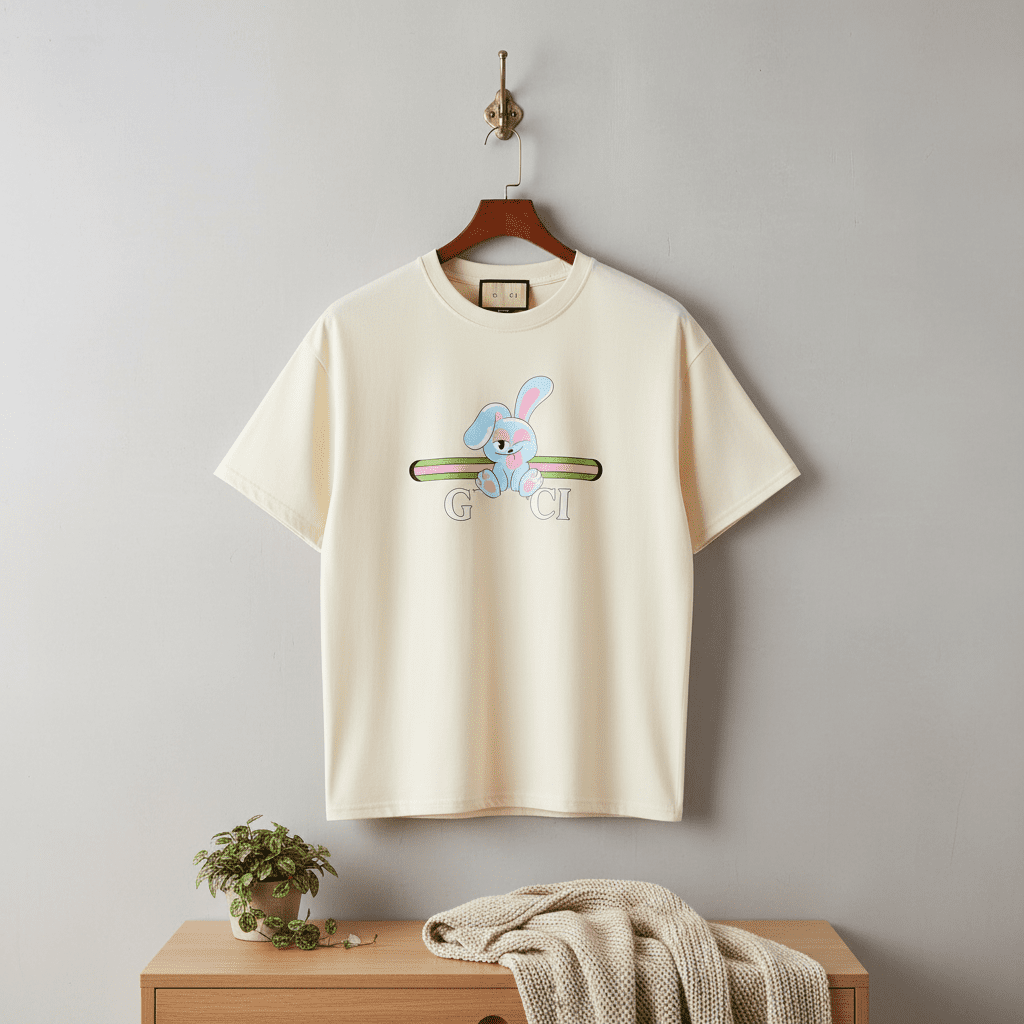Gucci Cartoon Bunny Series Off-White Cotton T-Shirt, soft breathable fabric, loose crew neck design, cute bunny logo with brand emblem, stylish unisex casual wear for daily comfort and personality.