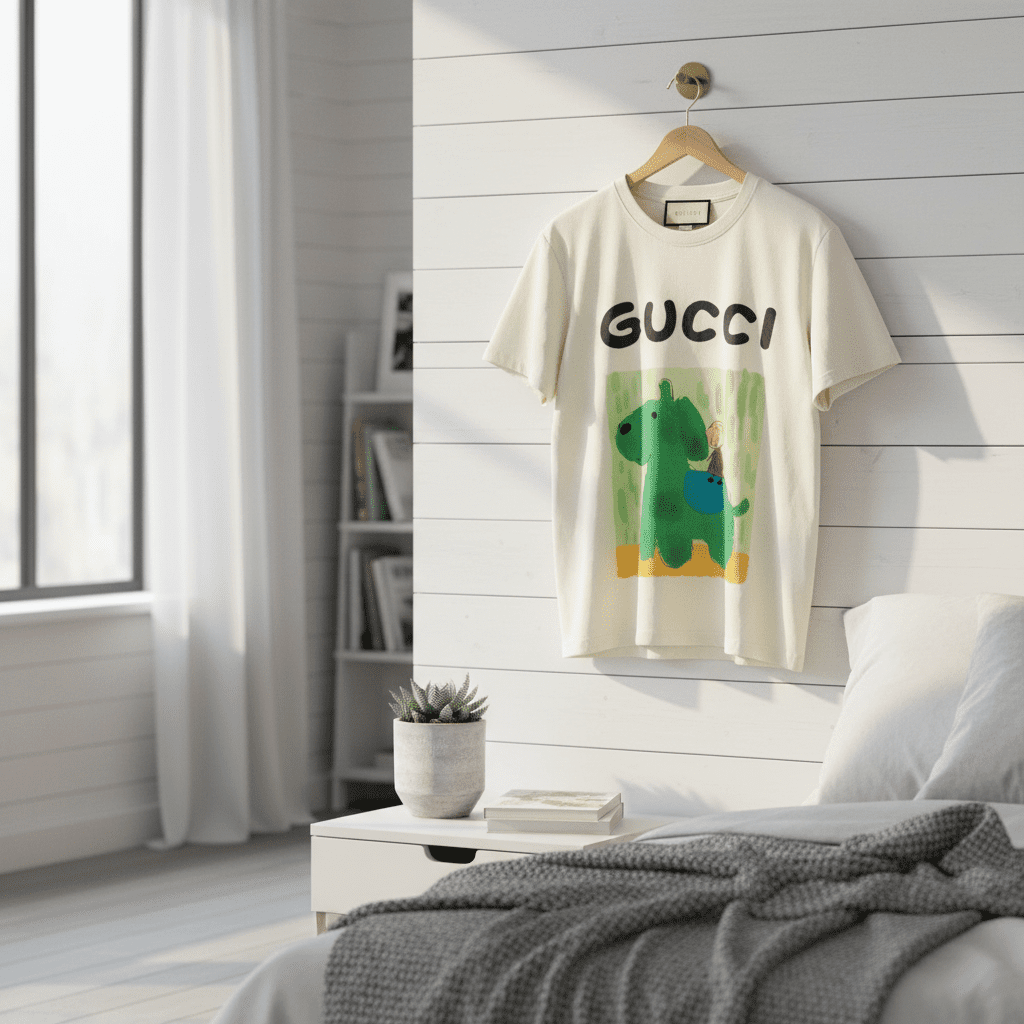 Gucci beige cotton T-shirt featuring soft premium fabric, black brand letters, and a playful cartoon print. Unisex casual fashion for daily wear, blending comfort with modern individuality.