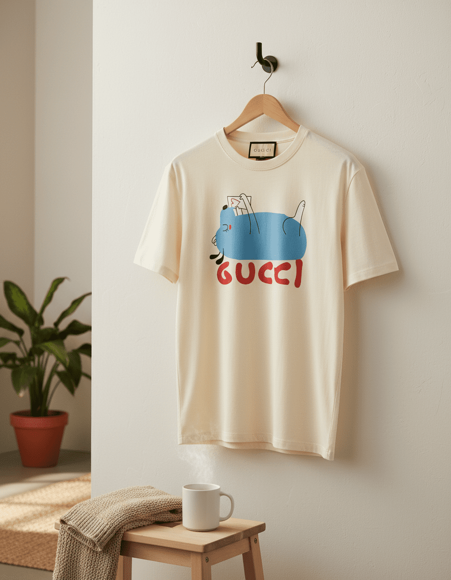 Gucci Off-White Cartoon T-Shirt, crafted from premium cotton with a crew neck and short sleeves, features a blue cartoon graphic and red Gucci lettering for a trendy, unisex casual look.
