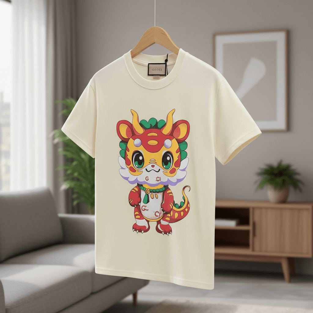 Gucci Zodiac Limited Edition Off-White Cotton T-Shirt with Cartoon Mythical Beast Print, Unisex Casual Style, Soft Breathable Fabric, Fashionable and Playful Design Highlighting Brand Charm.