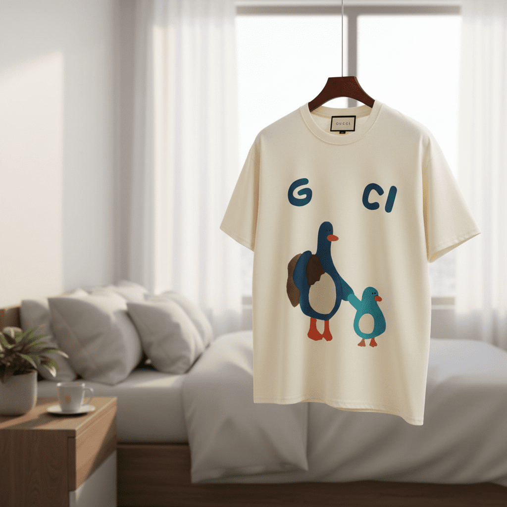 Gucci off-white cotton T-shirt with cartoon duck print and letter design, unisex loose fit, soft and breathable, casual cute style showcasing playful fashion charm.
