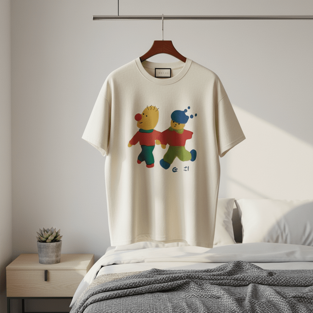 Gucci Off-White Cartoon Print Cotton T-Shirt, breathable and soft fabric, round neck design, unisex fit for casual daily wear, showcasing playful charm and modern style.