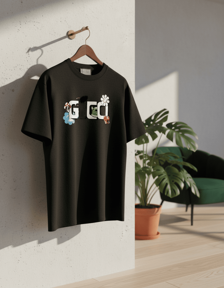 Gucci Black Cotton Crewneck T-Shirt featuring cartoon-style Gucci logo with mushrooms and flowers, soft breathable fabric, unisex design, trendy casual wear for everyday fashion.