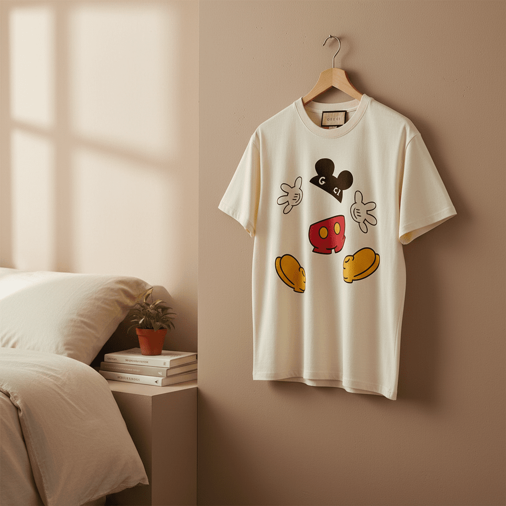 Gucci x Disney off-white T-shirt made from premium breathable cotton with Mickey-inspired graphic print, classic crew neck, unisex design, stylish and comfortable for everyday wear.
