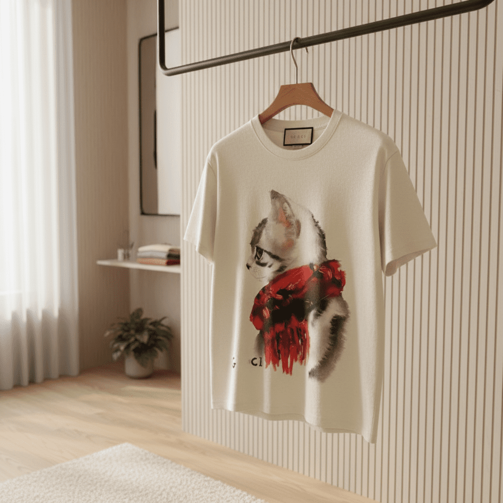 Gucci off-white unisex T-shirt crafted from premium cotton, soft and breathable, featuring a cute cat with a red scarf and G CI lettering. Perfect for casual fashion that shows personality.