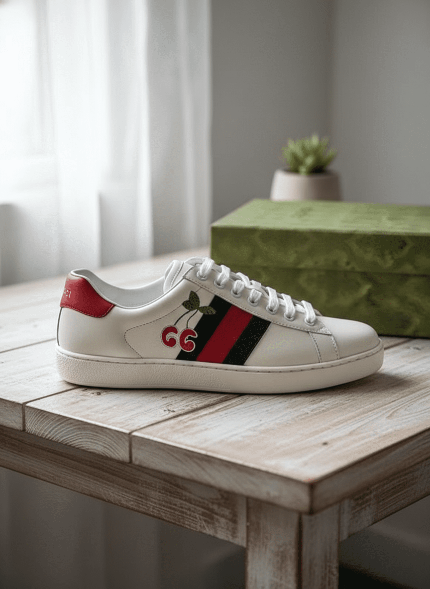 Gucci Ace White Leather Sneakers feature iconic red-green web and cherry embroidery, offering timeless luxury and unisex sporty style perfect for everyday fashion.