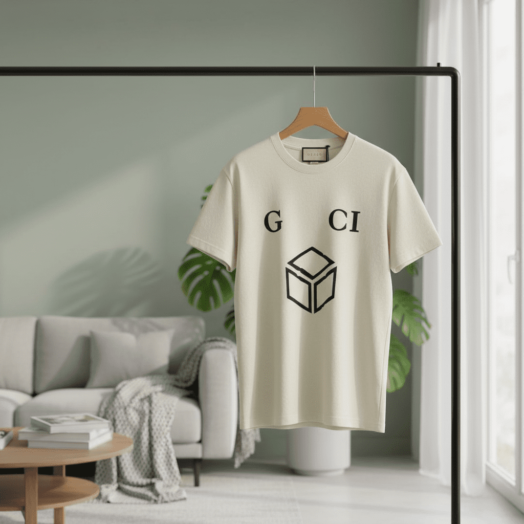 Gucci off-white T-shirt crafted from premium cotton, soft and breathable. Features black "G CI" letters with cube graphic. Unisex minimalist design for casual daily wear with signature brand style.