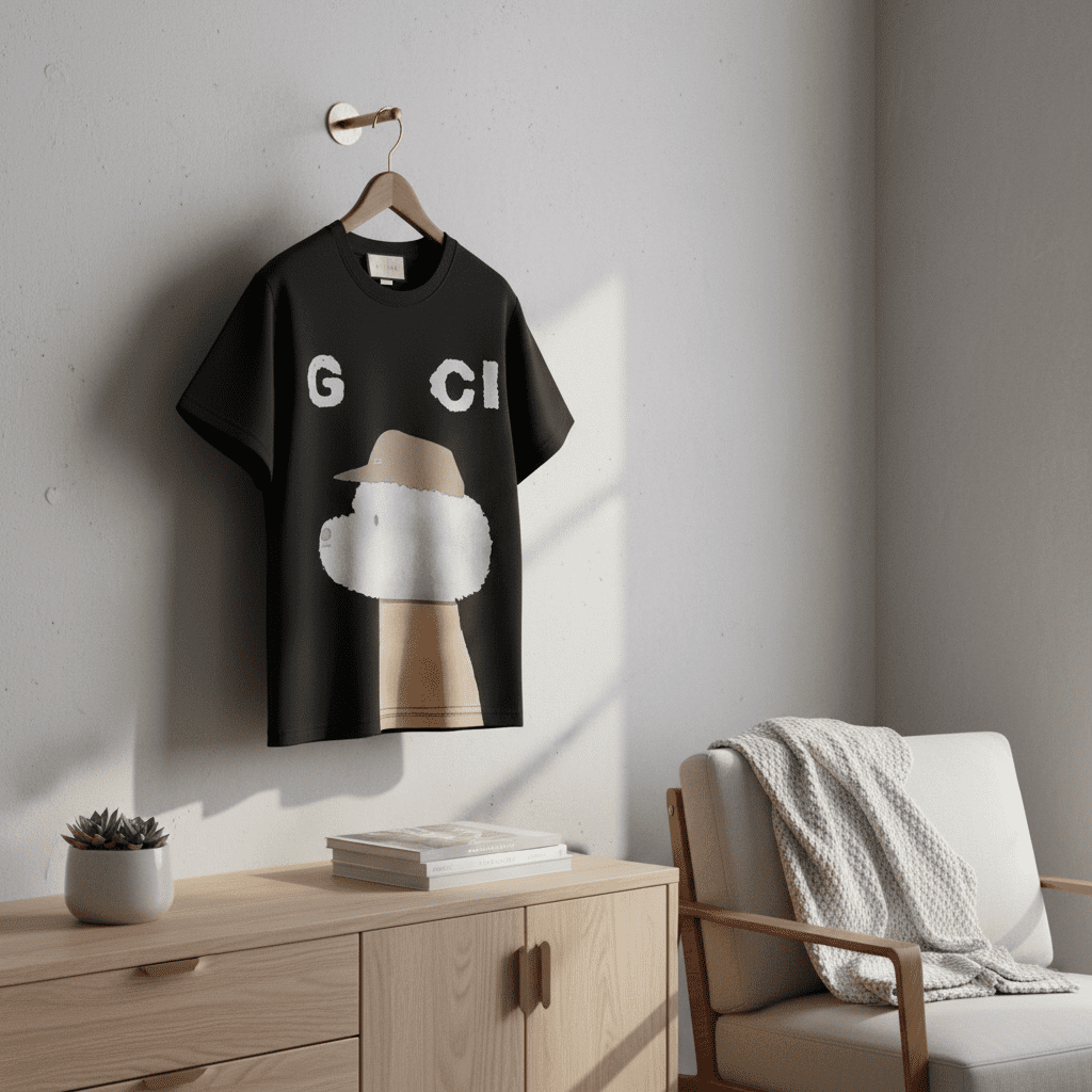 Gucci Black Cartoon Dog Print T-Shirt made from premium breathable cotton, features playful “G CI” letters and a cap-wearing dog design, stylish unisex tee perfect for casual daily wear and street fashion.