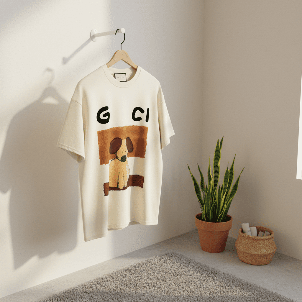 Gucci off-white cotton T-shirt with cute cartoon dog print and “G G CI” logo, soft breathable fabric, unisex casual style for daily wear blending comfort and playful fashion charm.