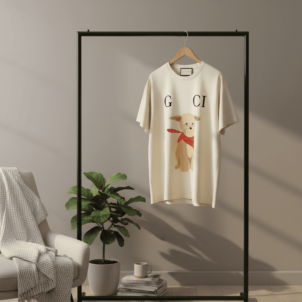 Gucci Off-White Printed T-Shirt featuring a cute dog with a red scarf and “G CI” logo. Made from premium cotton, unisex design, perfect for stylish casual everyday wear.