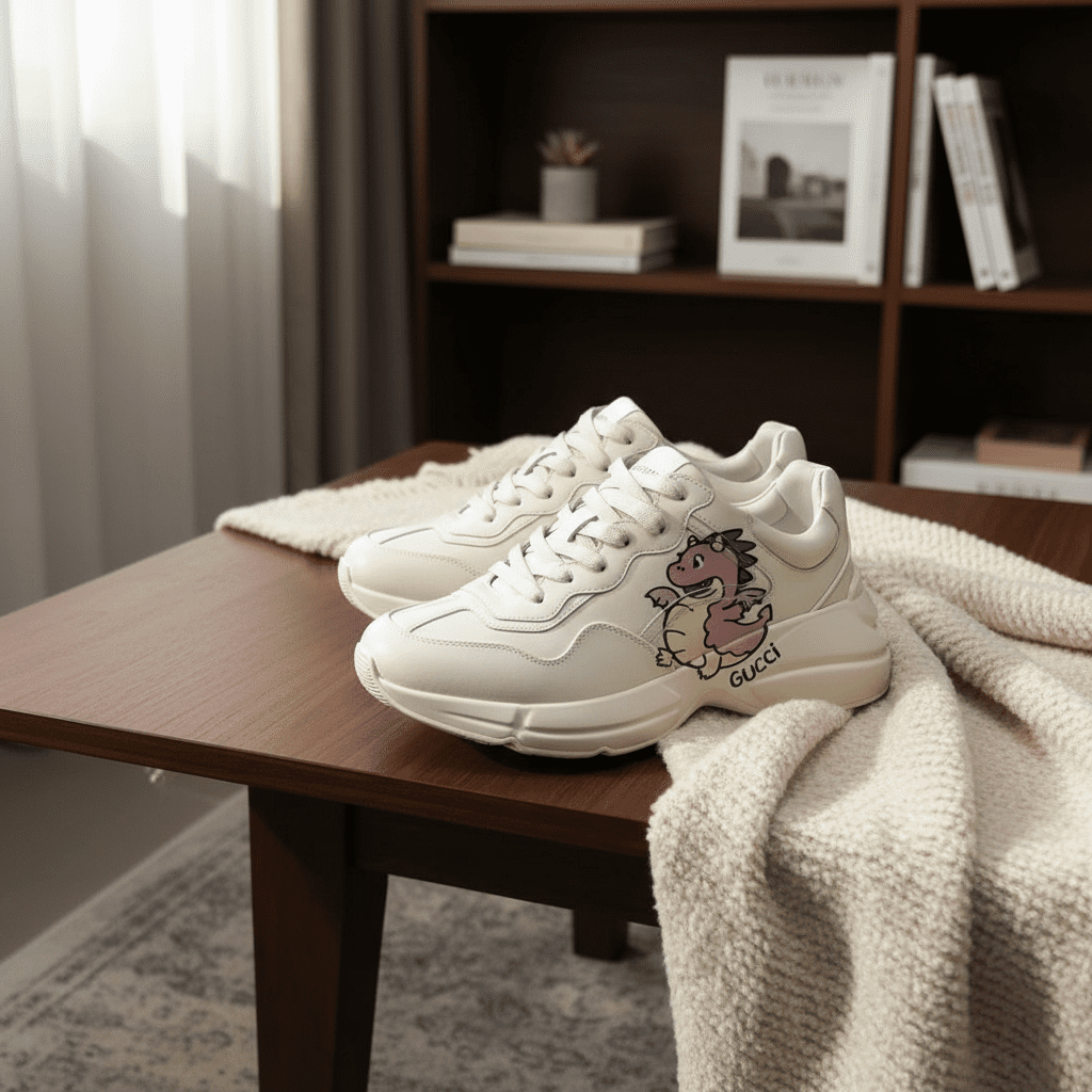 Gucci White Leather Sneakers feature a playful cartoon dragon print, stylish yet casual unisex design, premium comfort for everyday wear, showcasing iconic Gucci creativity and modern fashion appeal.