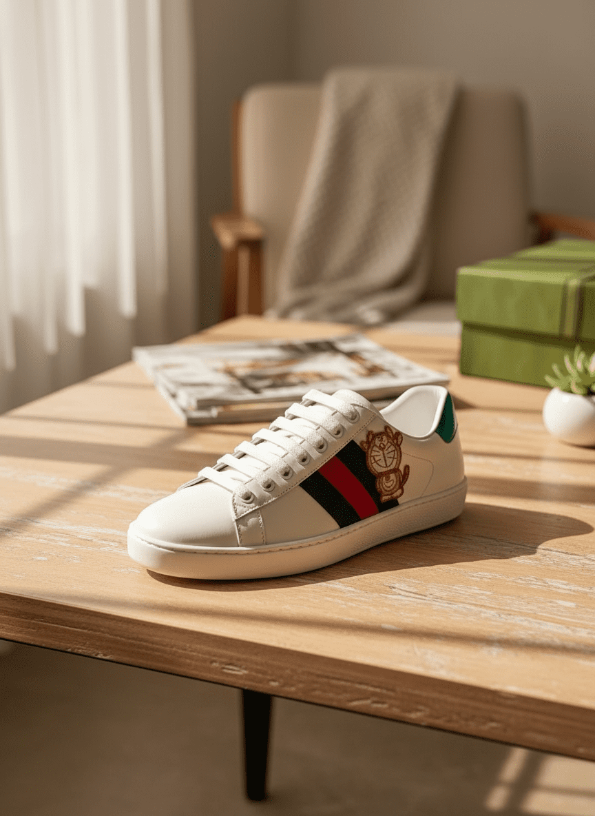 Gucci Ace white leather sneakers with signature red-green web and Doraemon embroidery, stylish unisex design for casual wear, offering comfort and fashion in every step.