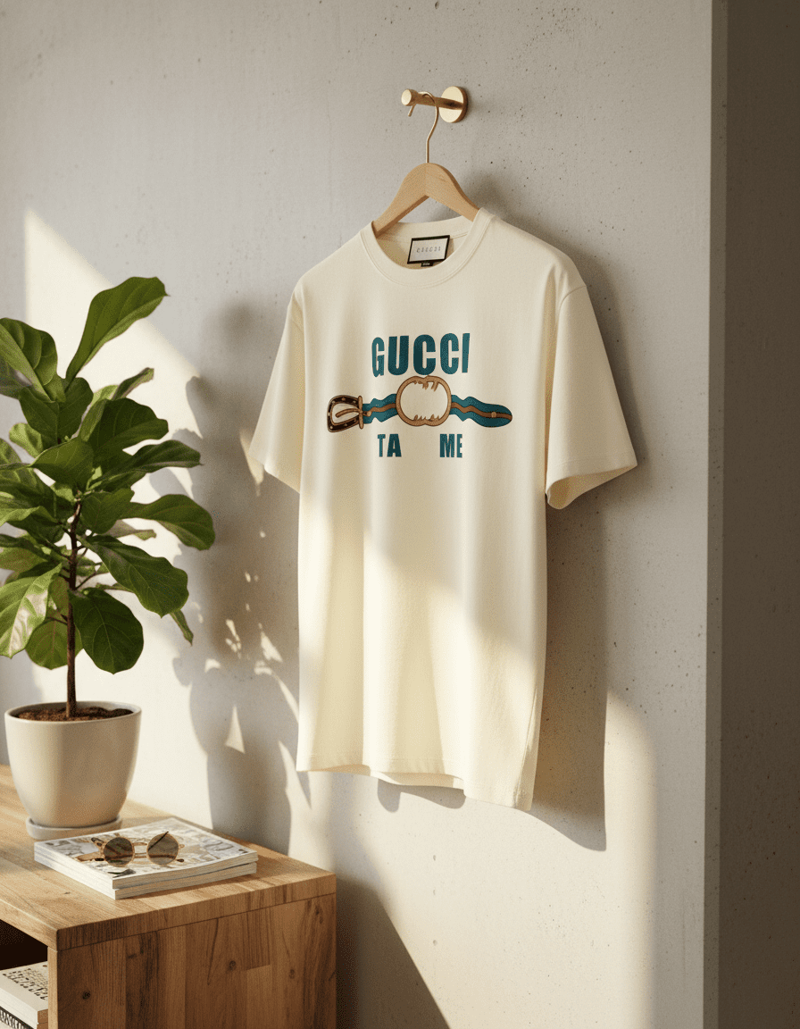 Gucci Off-White Cotton T-Shirt featuring “GUCCI TA ME” text and belt buckle print. Unisex design, breathable and soft fabric for everyday casual wear with signature fashion style.