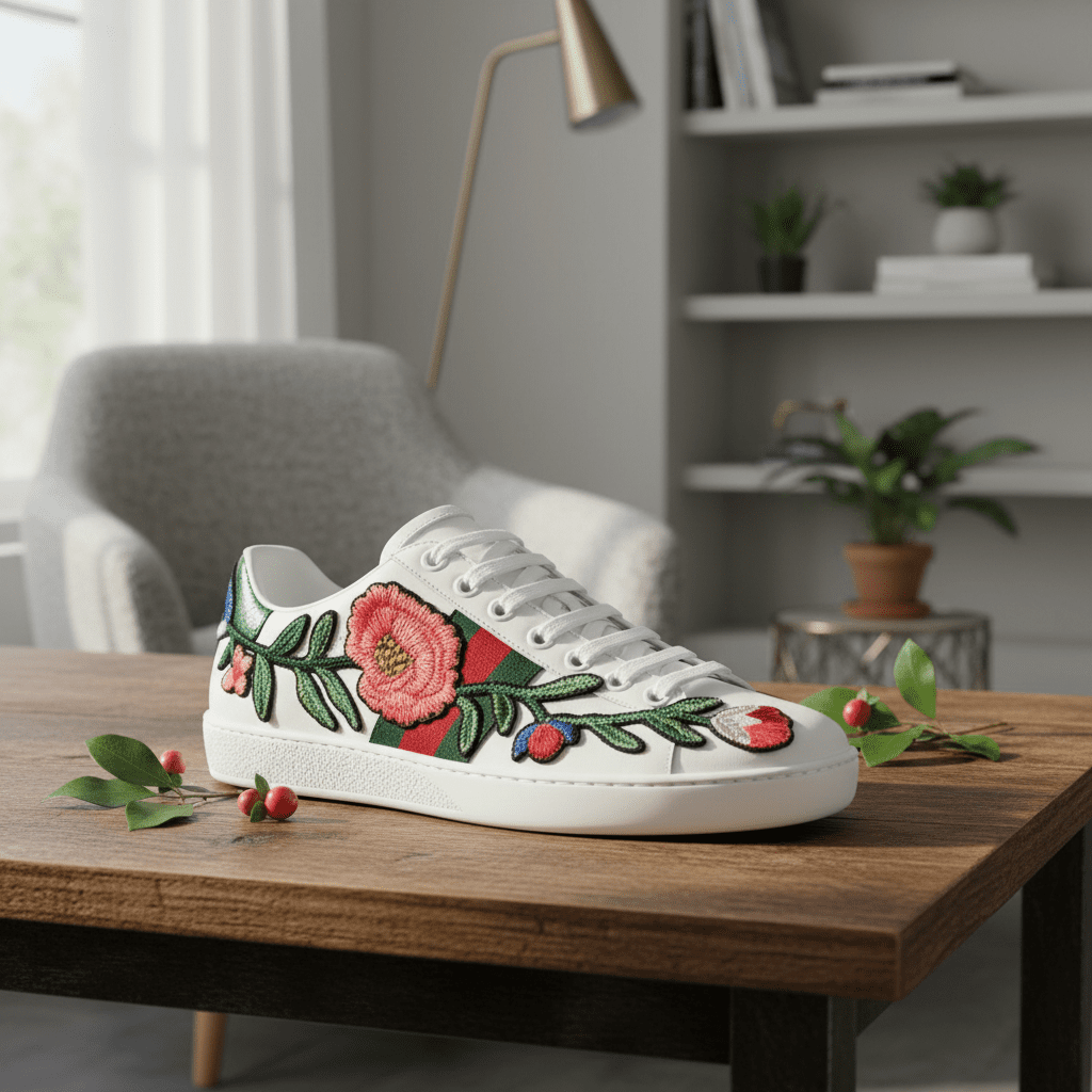 Gucci Ace white leather sneakers with signature red-green web and floral embroidery, unisex luxury casual style, comfortable and versatile, expressing refined elegance and designer charm.