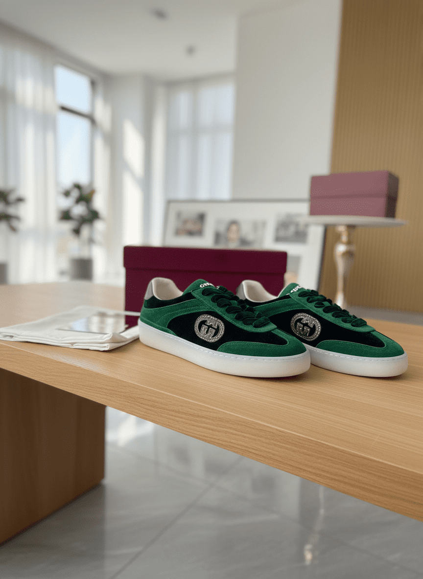 Gucci Green Black Velvet Sneakers feature luxurious velvet fabric, transparent sole, velvet laces, classic logo emblem, vintage yet modern design for unisex casual wear with comfort and refined style.